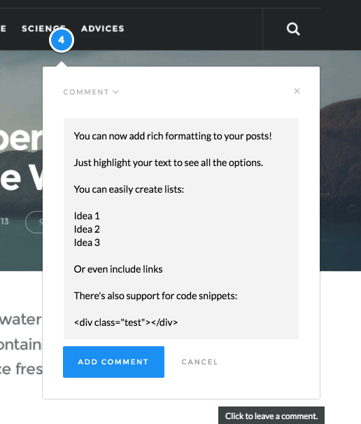 You now have more power to express yourself. We’ve added a powerful new visual editor that gives you rich content formatting. Highlight your text to bold, italicize, make lists, add hyperlinks and even code snippets. Go ahead and give it a shot!