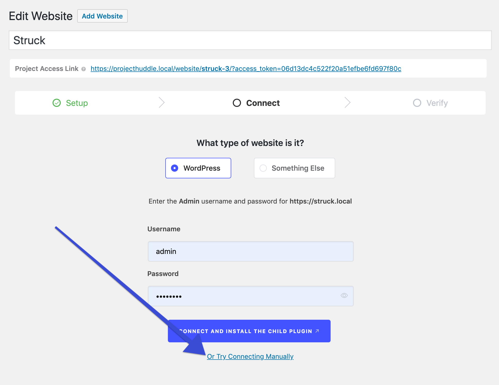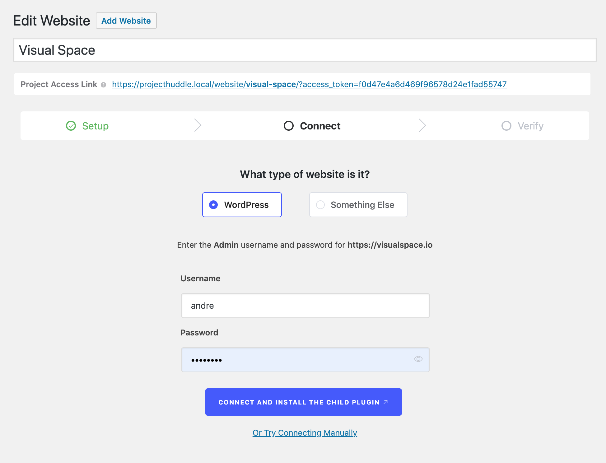 Enter the Admin Username and Password of your Client’s Site. After that click “Connect and install the child plugin” to continue.
