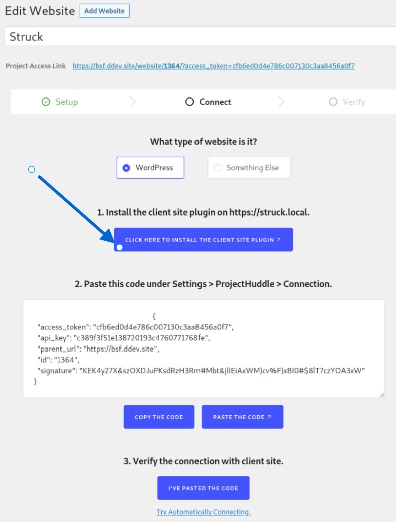 On your client’s site, under Settings > Feedback > Connection, you can paste the code to make the connection. Clicking the “Copy the Code and Click Here” button will take you directly to that page.