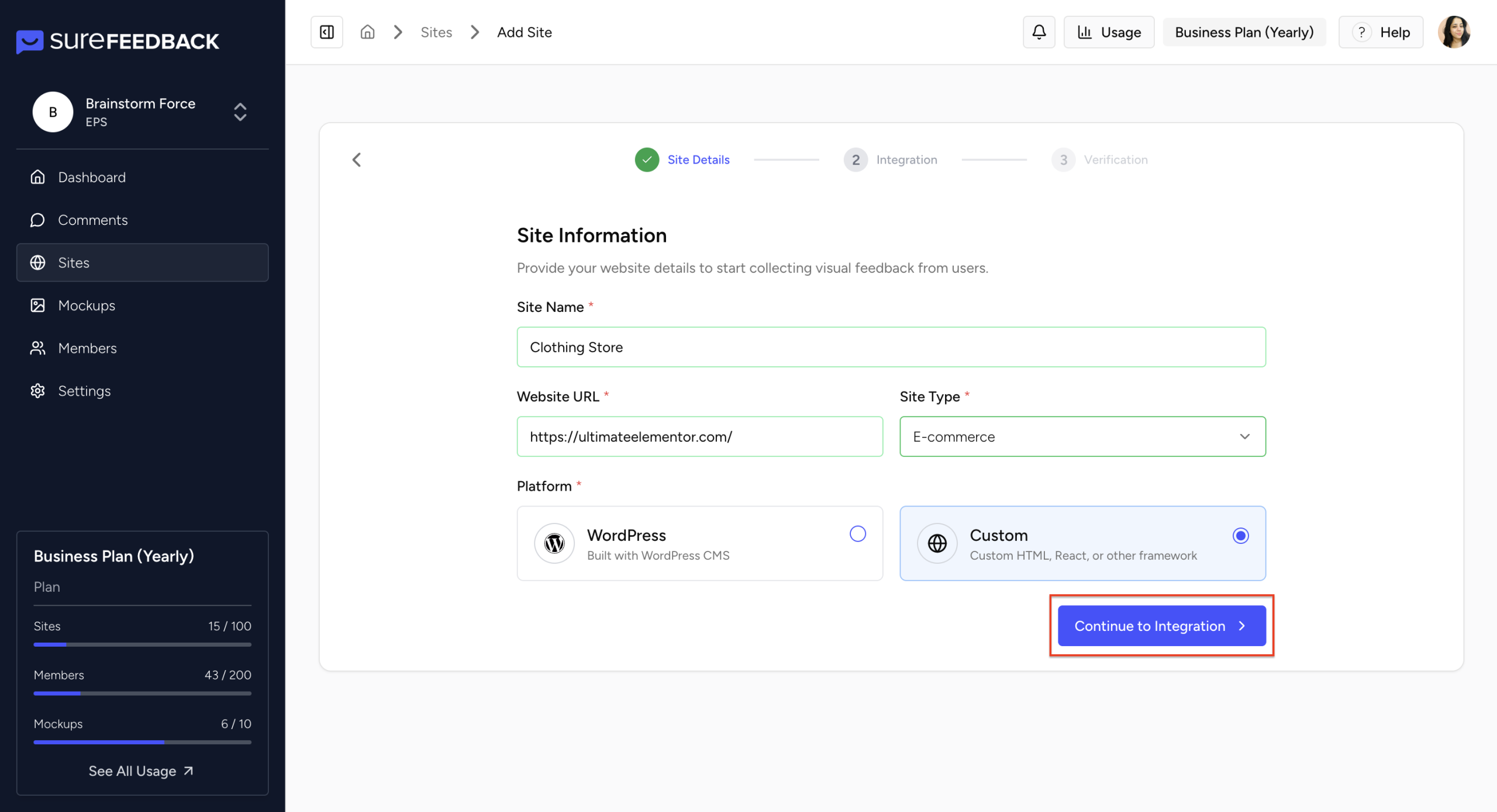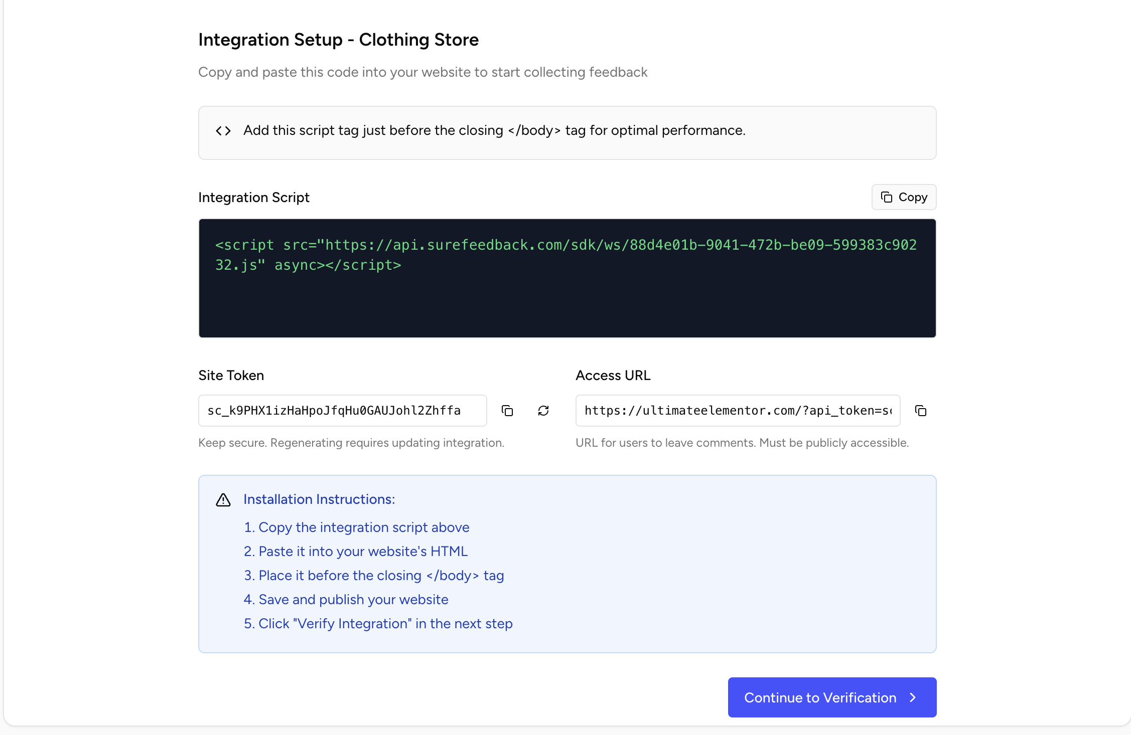 Connecting a custom website to SureFeedback is quick and requires only a small script added to your site. Follow the steps below to start collecting comments and feedback instantly.