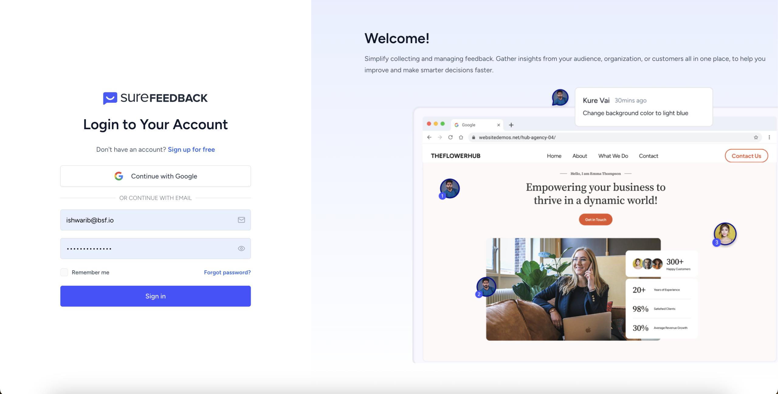 • If you are new to SureFeedback, sign up for free to create your account, otherwise login with your existing credentials.