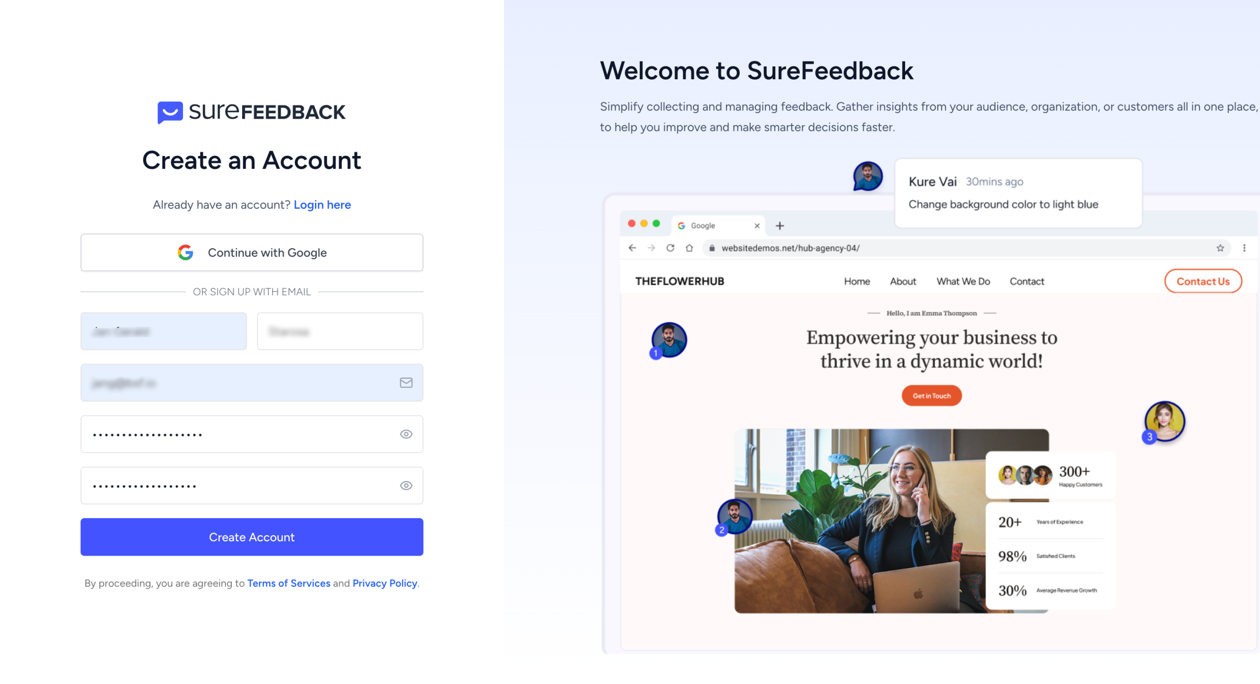 You can also sign up using your Google account. This skips the manual form and lets you access SureFeedback with a single click.